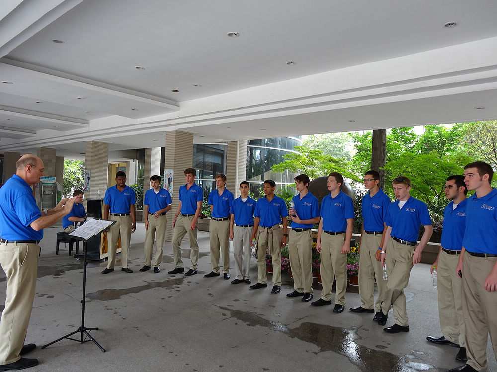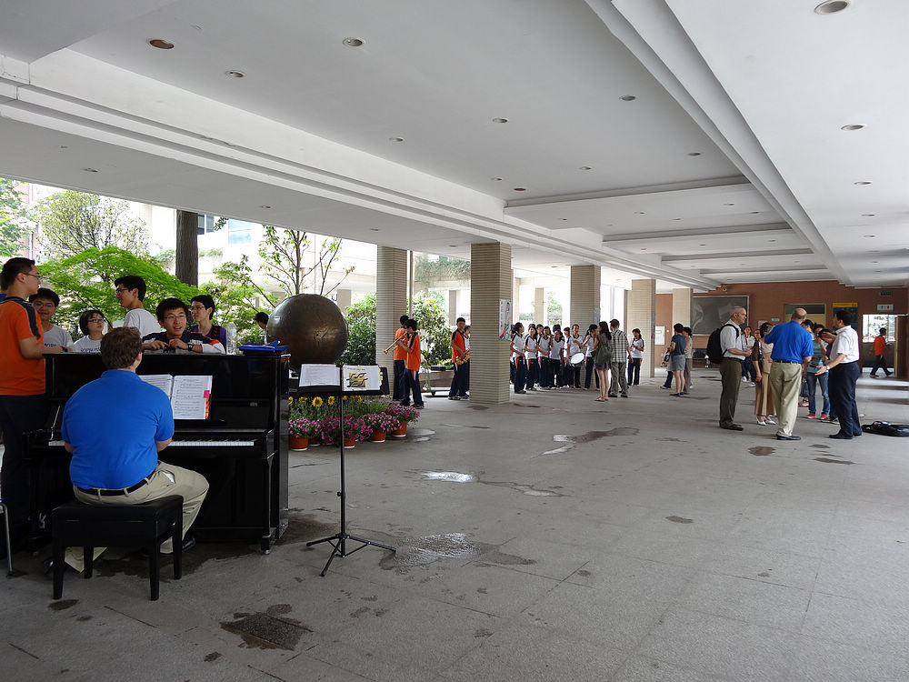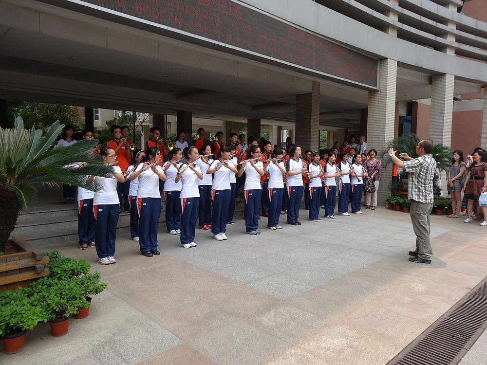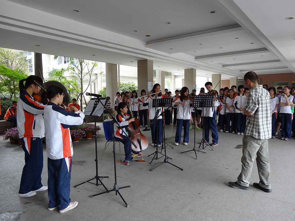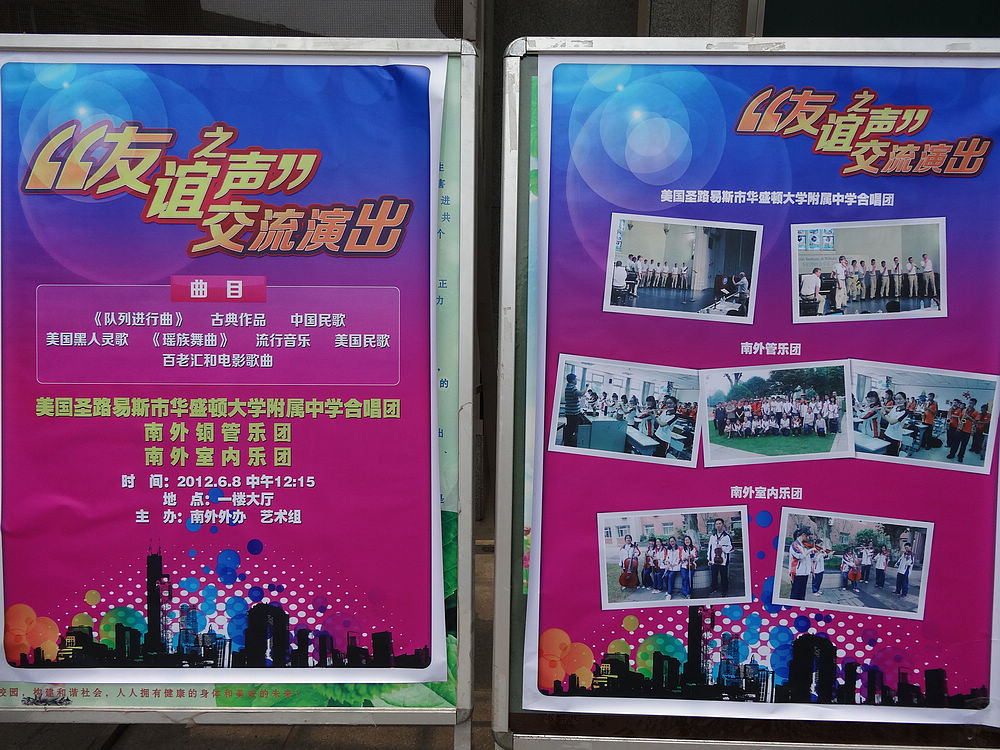2012年6月7日美国圣路易斯市华盛顿大学附属中学合唱团与南外铜管乐团和室内乐团进行了一场“友谊之声”交流演出,让南外师生大饱耳福。