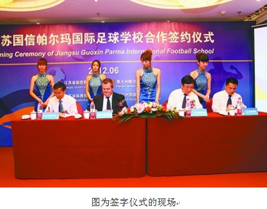 6月23日下午,江苏省国信集团、意大利帕尔玛足球俱乐部、江苏省体育局和共同在北京举办了江苏国信帕尔玛国际足球学校的签字仪式。在新闻发布会上,江苏国信集团副总经理徐祖坚,意大利帕尔玛足球俱乐部主席吉拉尔迪,江苏体育局所属的江苏苏体有限公司董事长顾晔和副校长王瑞卿分别代表合作四方签署了合作协议。