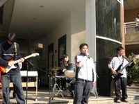 艺术节期间音乐社的活动重点主要是依靠乐队进行表演。在学校的演出,社团成员之前做了大量的工作。落实场地、联系电教组、租鼓、调试设备,这其中克服了极大的困难,才保证了演出的顺利进行。演出现场大家看到一排的音箱和一堆接线真是让人眼花缭乱,这是他们用一节课的时间一点点调试、一条条电路检查,才最终保证了音响的效果。当激昂的音乐传遍校园的时候,所有同学的热情都被他们点燃了。