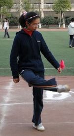 随着裁判员一声哨声,踢毽子比赛正式开始。操场上随即响起此起彼伏的加油声,各