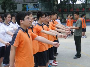 齐步走和正步走是我们接下来的训练任务,训练中对我们的定力是极大的考验。先是齐步走中的原地摆臂练习,教官对摆臂的角度、高度都有着严格的要求。在训练时常常将动作定在那里五、六分钟,没有命令不能动,手臂往往放下了,就抬不起来,但是对于军人来说“服从命令是天职”,再大的困难也要克服。齐步会走了,还要走得整齐,需要的是每一位同学的配合。每人和前排同学看齐,也要注意用余光和旁边的同学看齐,这就要我们集中注意力,不能随便开小差,这样的训练也有利于上课听课效率的提高。正步走的学习开始了,总是在重复着相同动作的我们,对踢正步感到新鲜。可是接下来的训练,打消了我们这个念头:踢正步这个动作主要在脚上,所以分解动作的时候,腿要踢高,将重心向前移,另一只脚承担着身体的重量且立在那里不能动。汗水从我的脸颊划
