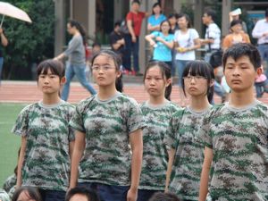 军训是很紧张的,但我们的生活也丰富多彩,在高一(8)班的新集体中,同学互相帮助:第一天,我的脚扭伤了,同学送来了云南白药;有同学中暑了,我们扶她到一旁休息。在军营中我们自己洗衣、洗碗、整理寝室,所谓“自己动手,丰衣足食”。