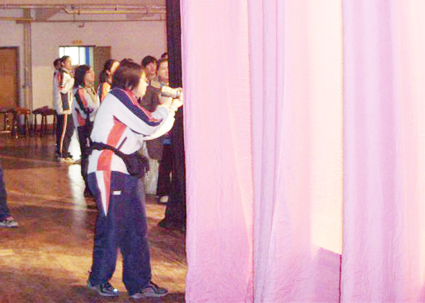当电教组老师的摄像机架在正对台前的高台上,捕捉同学们精彩绝伦的表演时,我们在幕后用自己简单的器材,收集那些同样精彩的幕后同学们的汗水与欢笑。