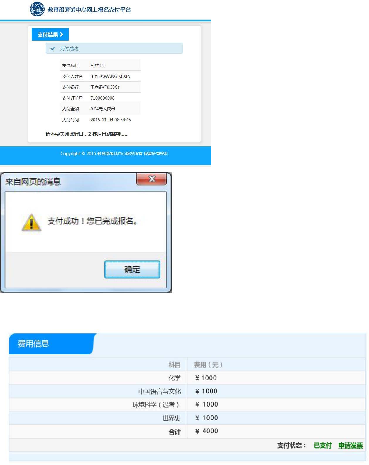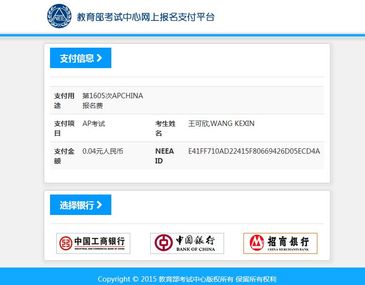 AP常规考试与延迟考试的报名及缴费时间一致。 中国大陆举办的AP考试暂时不接收残障考生的报考。 三、开考科目 •2016年开考科目及各科目的考试时间详见2016年AP考试时间表 四、考试费用 •AP考试每科费用为1100元人民币。 五、报名要求 • 在中国大陆地区(不含香港、澳门及台湾),只允许参加了AP课程全程学习的学生报名参加AP考试。 • 参加AP考试的考生,年龄在考试当年5月31日不满21岁的方可报名。 • 报名时,考生须确认所提交全部信息的真实性和准确性,如与实际证件上的信息不符,将导致考生无法参加AP考试。 六、迟考考试(Late Testing)报考要求 1. 延迟考试科目仅限以下三个科目: A. 环境科学 B.艺术史 C.人文地理 2. 考生只有同时报考以下时间相冲突的科目时,才可以报考延迟考试: A. 环境科学和化学 B.艺术史和物理1 C.人文地理和微观经济 3. 如果考生报考的科目没有时间冲突,则不允许报考延迟考试。例如:如果考生只报考环境科学,则该考生只能报考常规AP考试时间表中的环境科学。 七、身份证件要求 • 考试当日,考生如未携带报名时使用的证件或携带证件与报名时提交的不符,将被拒绝进入考场,考试费不予退还。 • 中国大陆AP考试对身份证件的规定如下: 1. 中国大陆考生参加AP考试,必须携带唯一有效的身份证件即“中华人民共和国居民身份证”原件。根据《中华人民共和国身份证法》,任何居民无论是何年龄,均可向户籍所在派出所申领身份证。特别提醒未申领身份证的青少年考生提前办理,以免影响考试。 2. 香港、澳门地区考生必须使用有效香港、澳门身份证原件或港澳通行证原件。 3. 台湾地区考生必须使用有效台湾居民往来大陆通行证原件。 4. 非中国籍考生必须携带有效护照原件报名及参加考试,护照明确显示考生姓名、照片和签字。 注意:证件上的姓名和生日等个人信息必须与报名信息完全一致。确保证件在有效期内。 • 考生在考试时须携带与准考证信息一致的有效身份证件原件参加考试。 •出现下列情况之一的考生,将被拒绝入场,并不退还考费或改期安排考试: 1.抵达考点与网上报名所选考点不一致; 2.未携带准考证或规定的有效身份证件; 3.所携身份证件的有效性未通过核验; 4.身份证件类型和号码与所持准考证显示信息不符; 5.准考证相片、身份证件相片与本人明显不符; 6.未按准考证规定时间到达考场; 7.不服从监考人员的管理,扰乱考场秩序。 八、网上报名相关准备 • 网上支付考费:AP考试的支付方式仅限于网上支付。考生可任选中国银行、中国工商银行或招商银行的网上银行支付系统交纳考费。 九、电子照片和电子签名的上传要求 •AP学校考生和社会考生在网上完成报考信息填写后,须上传考生本人的电子照片和电子签名。 •电子照片上传要求:考生报名时须提交本人电子照片,该照片将打印在准考证上。请注意如下事项: 1: 本人在六个月内的近照; 2: 正面免冠,包括整体头部,脸部清晰; 3: 照片规格:横纵比为3:4,分辨率大于360像素X480像素; 4: 白色或浅色背景; 5: 黑白或彩色照片均可; 6: 文件大小在20KB到200KB之间; 7: 格式为JPG/JPEG。 •电子签名上传要求:电子签名为考生本人手写签名的电子照片。考生须将手写签名拍照后上传。请注意如下事项: 1.白色或浅色背景,黑色字体,笔迹清晰; 2.电子签名图片规格:横纵比为2.3:1,分辨率大于835 像素×360像素; 3.上传文件大小200KB 以下,20KB 以上; 4.格式为JPG/JPEG。 重要提醒:如照片不符合要求,例如压缩变形、非正面照等原因影响考试的后果自负。 •考生上传了电子照片和电子签名后,将视为考生已确认所填写信息的准确无误,并且保证上传照片为考生本人的照片,电子签名为本人手写,并保证所有信息与所持报考证件上的信息完全一致。 •如发生考生填写的信息与所持证件信息不一致的情况,考生将被禁止进入考场参加考试。 十、网上支付考试费 • 自2016年起,AP考试实行网上缴纳考试费。目前提供的支付方式共有三种:中国银行网上付费、 中国工商银行网上付费或者中国招商银行网上付费。选择您需要使用的银行,点击“继续”按钮。 • 要进行网上支付,①您须拥有一张中国银行、中国工商银行或中国招商银行的网上支付卡,请通过浏览他们的网站或询问营业点获得网上支付卡。通过点击相应的中国银行、中国工商银行或中国招商银行网上付费按钮便可开始进行网上付费。您将被引导到中国银行、中国工商银行或 中国招商银行的安全网页。 ②请按照银行网页的要求完成付费程序,付费完成后,请不要关闭银行支付页面,银行系统会自动引导您回到报名网站。③同时,请记录下银行提供的交易号码(支付号),以便日后核对和查询付款。④通常情况下,报名系统会立即收到您的付款确认。银行系统偶尔会有延迟向报名系统确认考生的付款或因考生主动关闭银行安全网页而无法立即获得付款确认的情况。⑤因此,请在付款1个工作日后,登录报名网站进入“报名信息查看页面”核实您的付费和报名状态。如仍未看到付费确认,请拨打AP考试呼叫中心咨询电话寻求帮助。 • 如您在银行网页上付费时网络连接突然中断,这时您的网上付费有可能未成功,请拨打银行服务热线确认您的付款是否完成。 十一、报考相关说明 • 报考时,如遇到生僻字,可以使用同音字代替;如