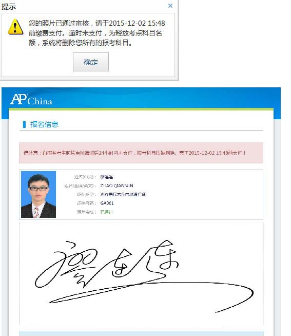照片通过审核后,登录报名网站,将会看到如下提示。