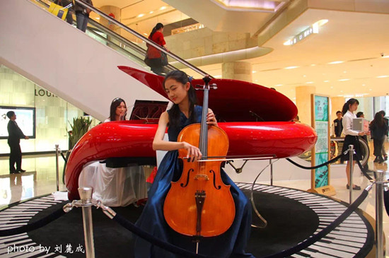 南外琴童美妙的音乐声吸引了众多游客驻足观看。身穿南外校服的志愿者,手捧捐款箱,穿梭在来来往往的人群中,向他们宣传圆梦助梦活动,并对每一个为实现学琴梦想而提供帮助的人献花表示感谢。