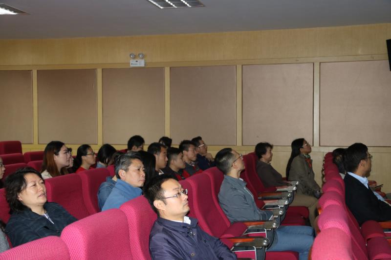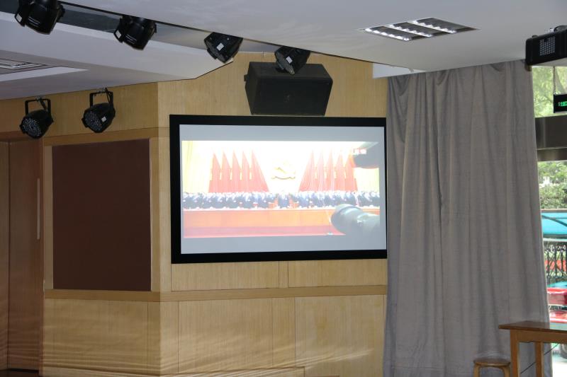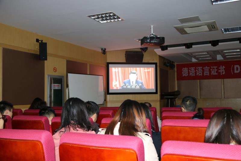 2017年10月18日上午,的小剧场里,全校教师第一时间通过直播学习领悟习近平总书记十九大报告精神。