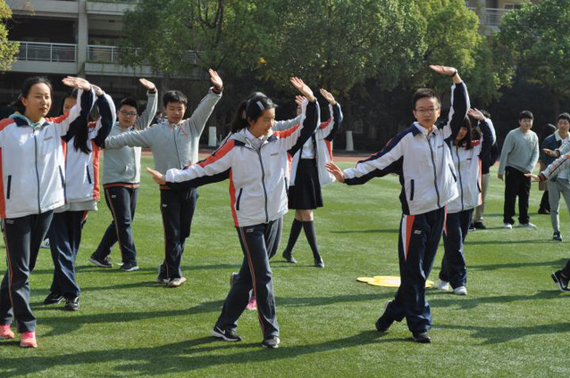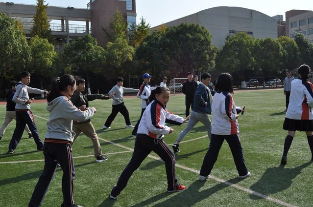操场上,大家按照8-10人一组的分组,学习健功拳,并进行表演。