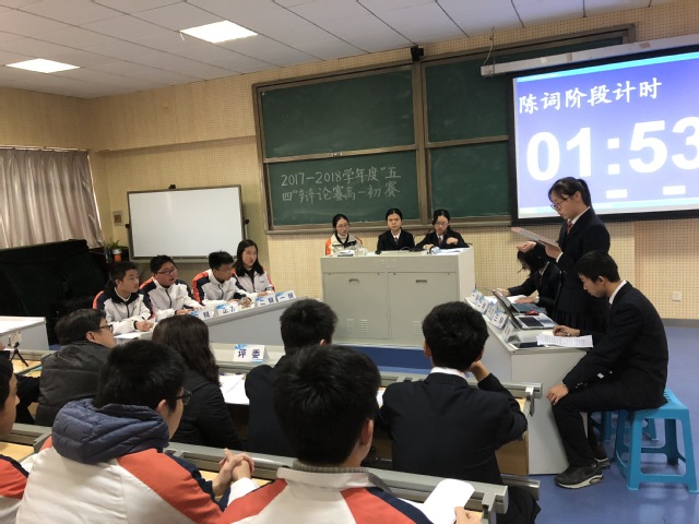 2018年3月19日下午三点至五点,E楼的二、三层阶梯教室迸射着思维碰撞现场的耀眼火花——一年一度的“五四”辩论赛高一年级初赛正在如火如荼地进行,高一年级全部八个班组建成的八个代表队之间展开了四场口舌与脑力的角逐。