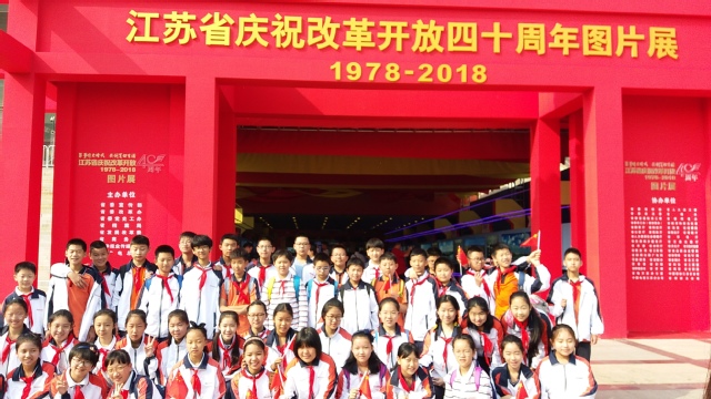 10⽉7⽇,初⼀年级同学和老师、家长们一起参观了江苏省庆祝改革开放40周年图⽚展。在“历史跨越”展厅陈列着“衣、食、住、行、用”等生活各方面的变迁,勾勒出改革开放给人民生活带来的实实在在的变化。40年前的老照片、老物件,让“00后”们感到新奇,仿佛“穿越”到自己的父辈、祖辈经历的那个年代,直观感受改革开放带来的巨大变化。“真没想到,改革开放前的人们穿着几乎一样的衣服!”看着1978年的老照片,同学们感到无比新奇。在当时,人们穿的是千篇一律的灰色或蓝色的中山装、解放装,被外国人形容为“灰蓝世界”,那时能拥有一件“的确良”就能成为时尚。这里记录了很多南京城的变迁,在国庆这个特殊的日子里参观,不仅能勾起大家浓浓的回忆,更能激发同学们的爱国热情。