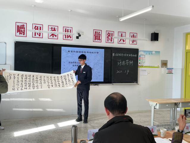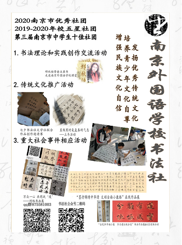 2020年11月份开始,南京市教育局组织开展了第三届南京市中学生社团展示评选活动,经过校内选拔、区级推荐和市级评审,书法社顺利入围45个获得决赛阶段的现场展评资格的社团。经过社团展示答辩,专家现场评分,书法社最终获得“南京市十佳中学生社团”(高中组)。