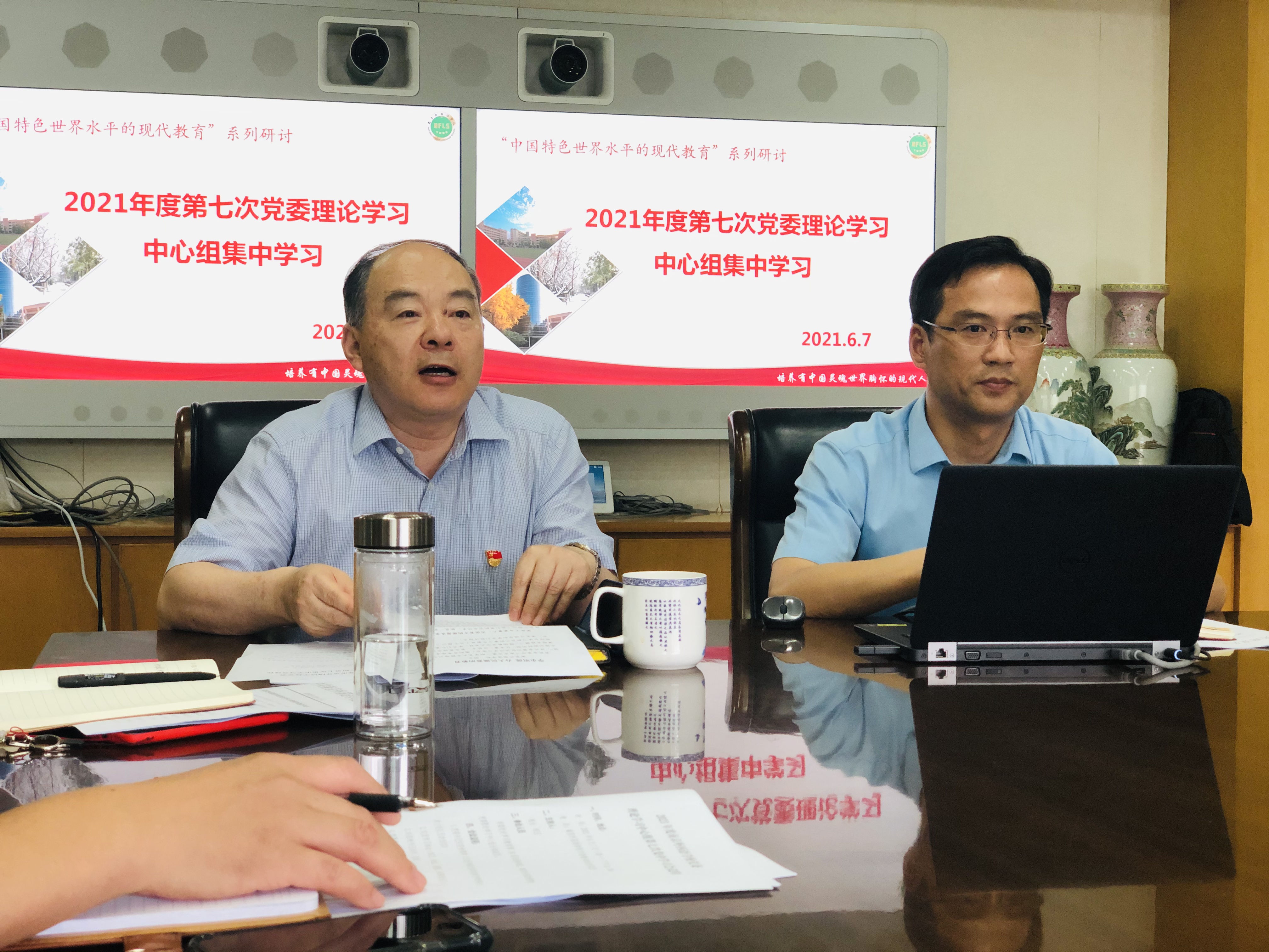 党委理论学习中心组2021年度第七次集中学习6月7日下午在行政楼410会议室举行。会议由邹正校长主持,中心组全体成员参加,开展党史学习心得交流。市委第十六巡回指导组同志列席旁听。