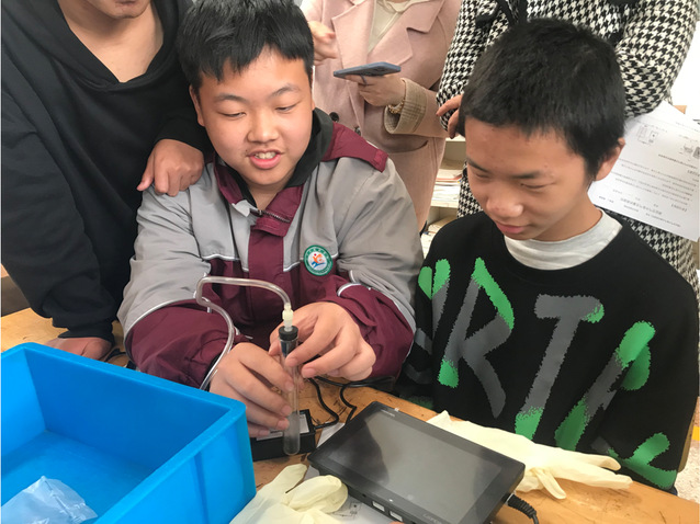 第三个环节是基于数字化实验的科学探究专题课,由工作室成员、殷晓婕老师执教《空气中氧气含量测定的再探究》,精妙的教学设计,灵动的体验教学,让孩子们化解了一个个教学难点,激发了学生学习化学的兴趣,优化了学生学习化学的思维,彰显了科学探究教学的生命力,也激发了全体观摩教师的研究热情。这也是周岗学校的孩子们第一次用LabQuest设备做定量探究实验。