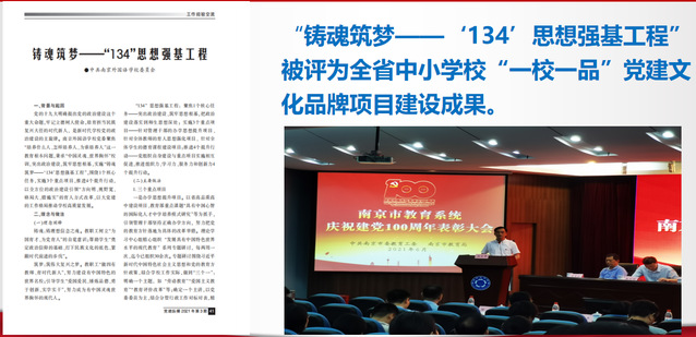 深入实施思想强基工程。认真落实市委教育工委党建文化建设“五个有”工作标准,努力创建党建文化品牌。近年来,为强化政治建设,我们深入实施“铸魂筑梦——‘134’思想强基工程”,这一项目于今年“七一”前被评为全省中小学校“一校一品”党建文化品牌项目建设成果,并于市教育系统庆祝建党100周年表彰大会上进行交流。“铸魂”是铸理想信念之魂,“筑梦”是筑伟大复兴之梦。我们聚焦“突出政治建设、筑牢思想根基,把政治建设落实到师生思想深处”这一核心任务,实施3个重点项目——针对管理干部的办学思想提升项目、针对全体教师的育人思想强化项目、针对全体学生的思想政治及德育课程建设项目,推进组织力、学习力、服务力和创新力4个提升行动,实现党组织自身建设与重点项目实施的相互促进,努力把正确的政治方向、育人的价值取向和尚实的工作导向落实到学校工作的所有环节。