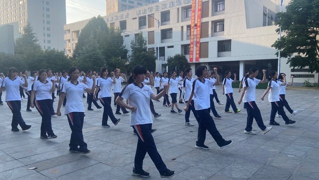 随着教官一声令下,女拳全体军体拳第一套的训练正式拉开帷幕,场上六十名女拳方阵的同学干脆利落地摆正姿势,整装待练。彼时清晨的阳光倾泻在这一方小小的天地间,使一切阴霾无处遁形。晶莹的汗珠顺着发丝滑落,折射着最为灿烂的天光,酝酿出青春最为亮丽的底色。